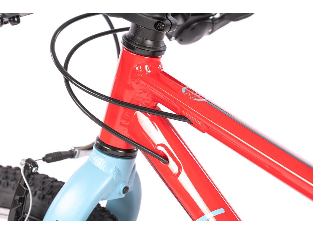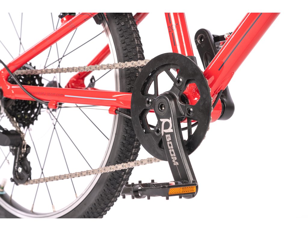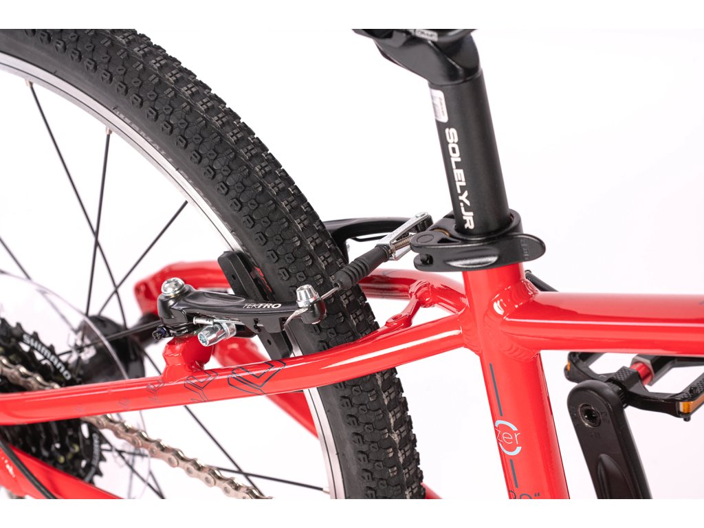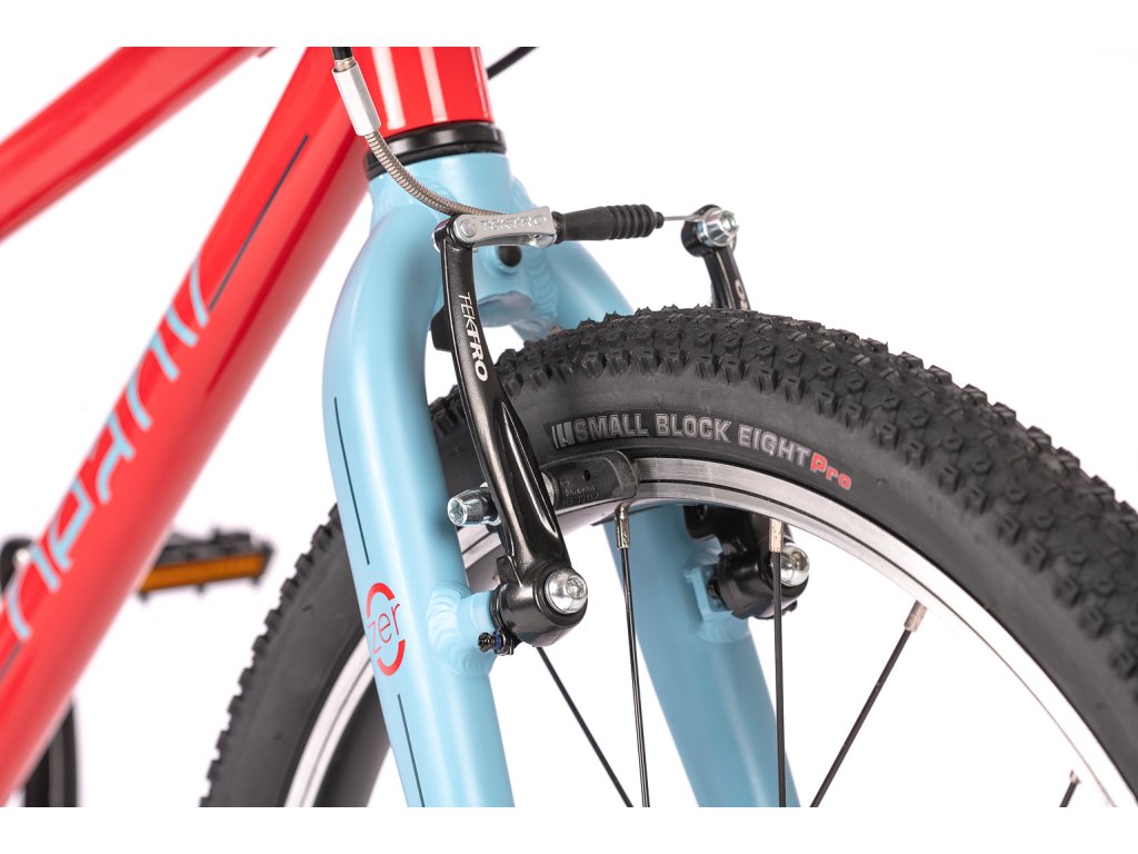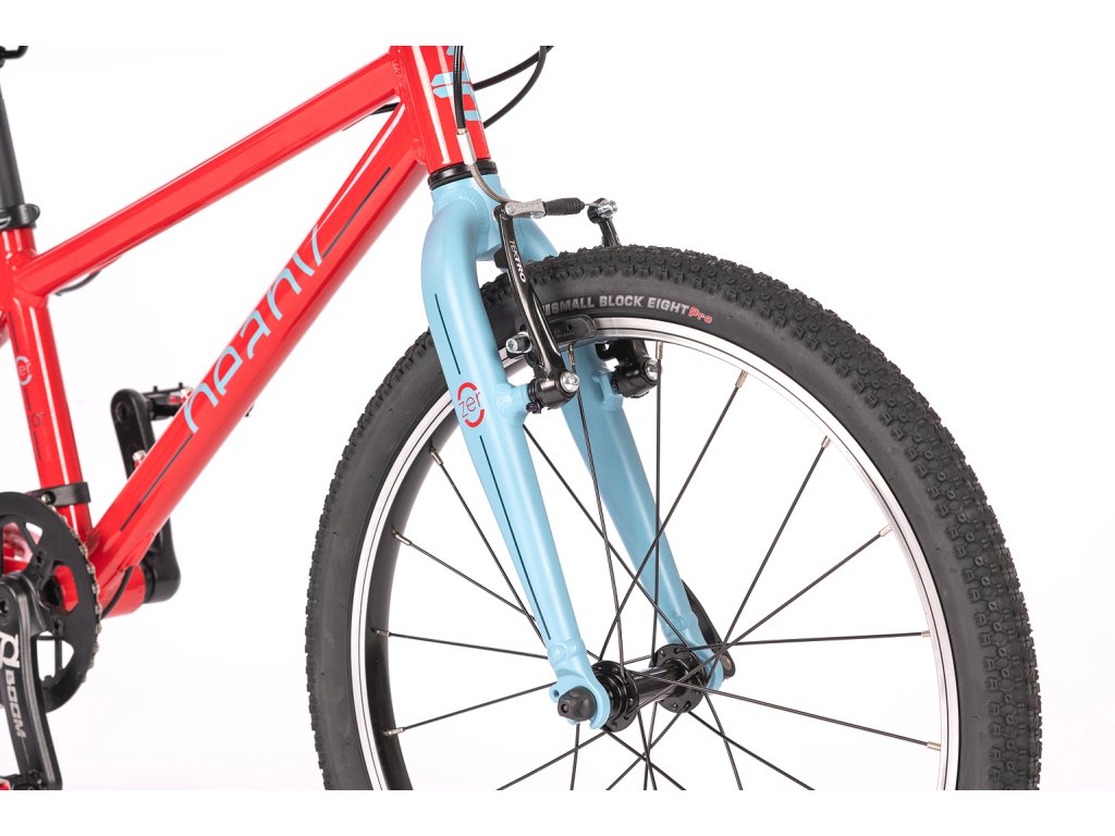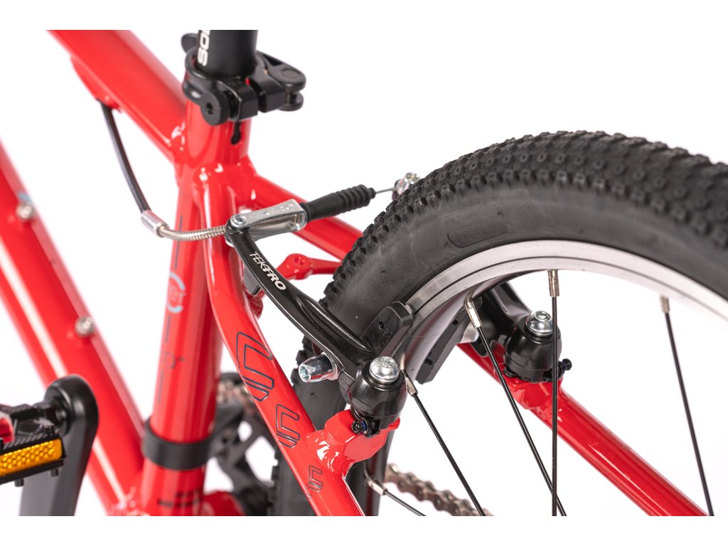 Prečo nemá odpruženú vidlicu? Pretože pri 20-palcových kolesách a váhe dieťaťa je úspora hmotnosti dôležitejšia ako nefunkčné pruženie. Pevná hliníková vidlica drasticky znižuje váhu bicykla, vďaka čomu dieťa ľahšie vyšliape každý kopec a bicykel lepšie akceleruje. O bezpečnosť sa starajú spoľahlivé V-brzdy (čeľusťové) s páčkami, ktoré sú veľkostne prispôsobené pre drobné detské ruky, takže na ne dieťa pohodlne dosiahne.