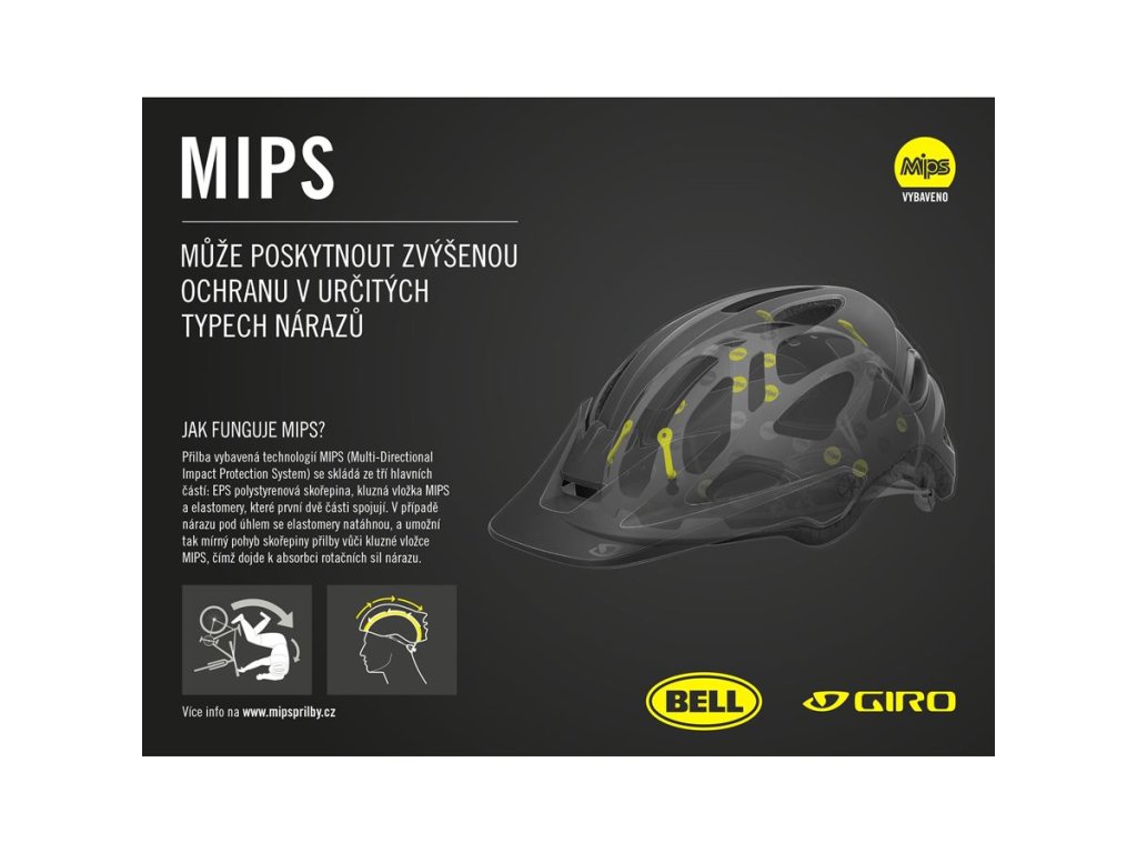MIPS (Multi-Directional Impact Protection System) poskytuje zvýšenú ochranu proti pôsobeniu rotačných síl na hlavu. Viac na www.MIPSprilby.cz