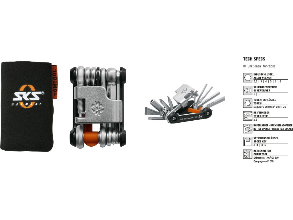 Kto je pripravený, nie je prekvapený. Vybav sa multifunkčným cyklonáradím SKS Germany Tom 18 ešte dnes. V štíhlom tele sa ukrýva kvalitné náradie z ocele, ktoré má 18 rôznych funkcií. Okrem bit inbus (2,5 / 3/4/5/6/8 mm) sú súčasťou aj 2 montážne páky, centrovací kľúč G14 a G15, plochý a krížový skrutkovač, Torx T25, rozťahovač brzdových doštičiek a otvárač, Nitovačky reťaze, držiak nitu a ulamovač nitu.